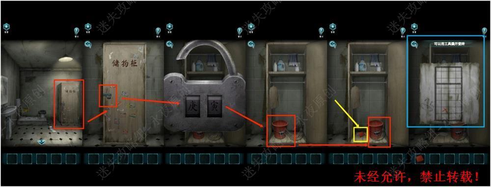 134.进入厕所,调查此处,输入庚寅,解锁柜门。调查水桶,挪动水桶,拾取【红色碎片】,可观察到线索纸片及提示“可以用工具撬开瓷砖”。134