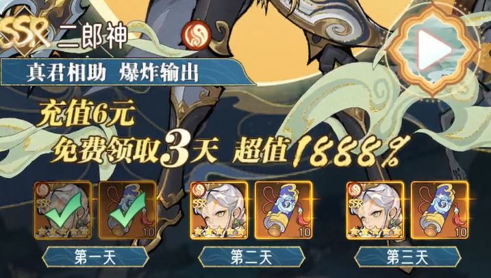 首从礼包目前是最最划算的,可以拿三个二郎神及30抽,另外首从礼包还有累从30及198档的奖励,给与核心英雄自选,橙色装备套装及二郎神皮肤,五星推荐