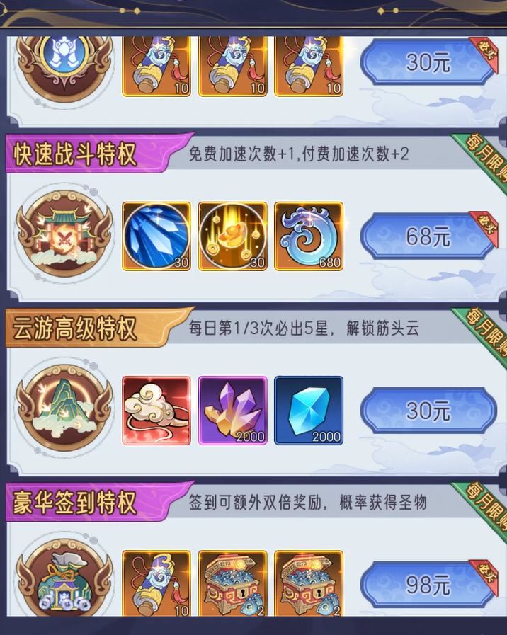 游戏中的这四个特权礼包一定要购买,简直是太划算了,购买好特权抽卡心愿可以开第二个位置,快速战斗特权增加3次,云游派遣刷新必出橙色任务,每日签到可以多领一次灵玉宝箱等等