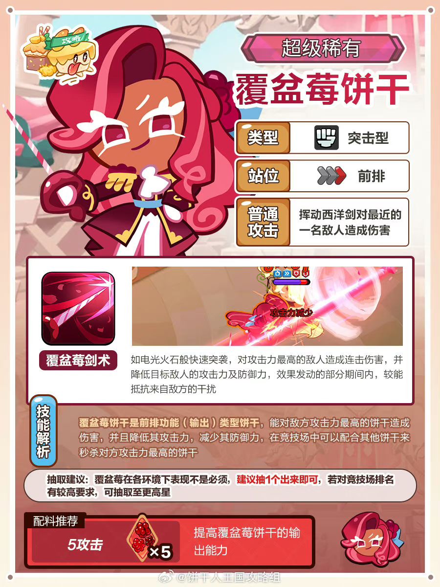 覆盆莓饼干是一个输出+功能的前排饼干,技能会瞄准敌方攻击力最高的单位释放,在部分阵容会有比较好的效果,但如果不打竞技场的话,覆盆莓在推图中优先级并不高。讨伐战中还在测试。
