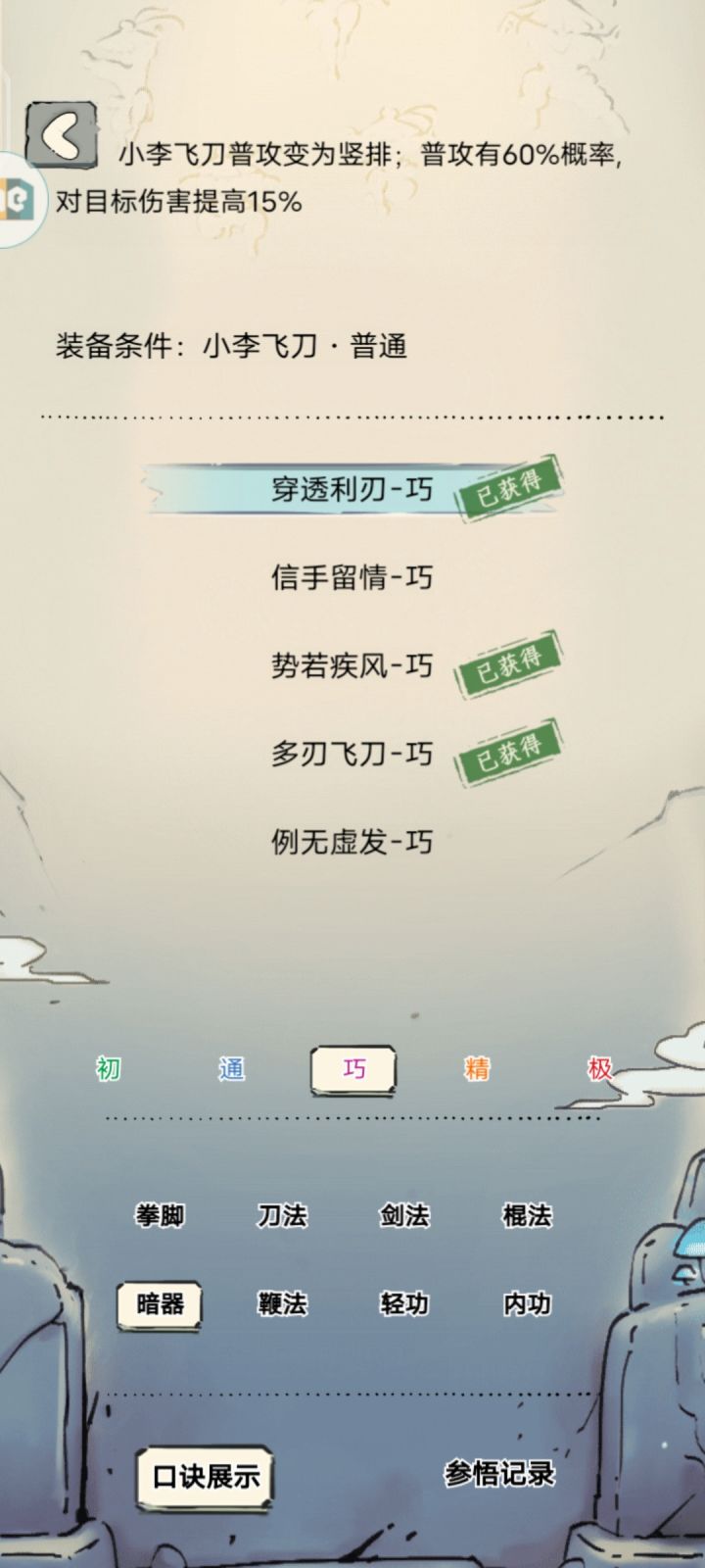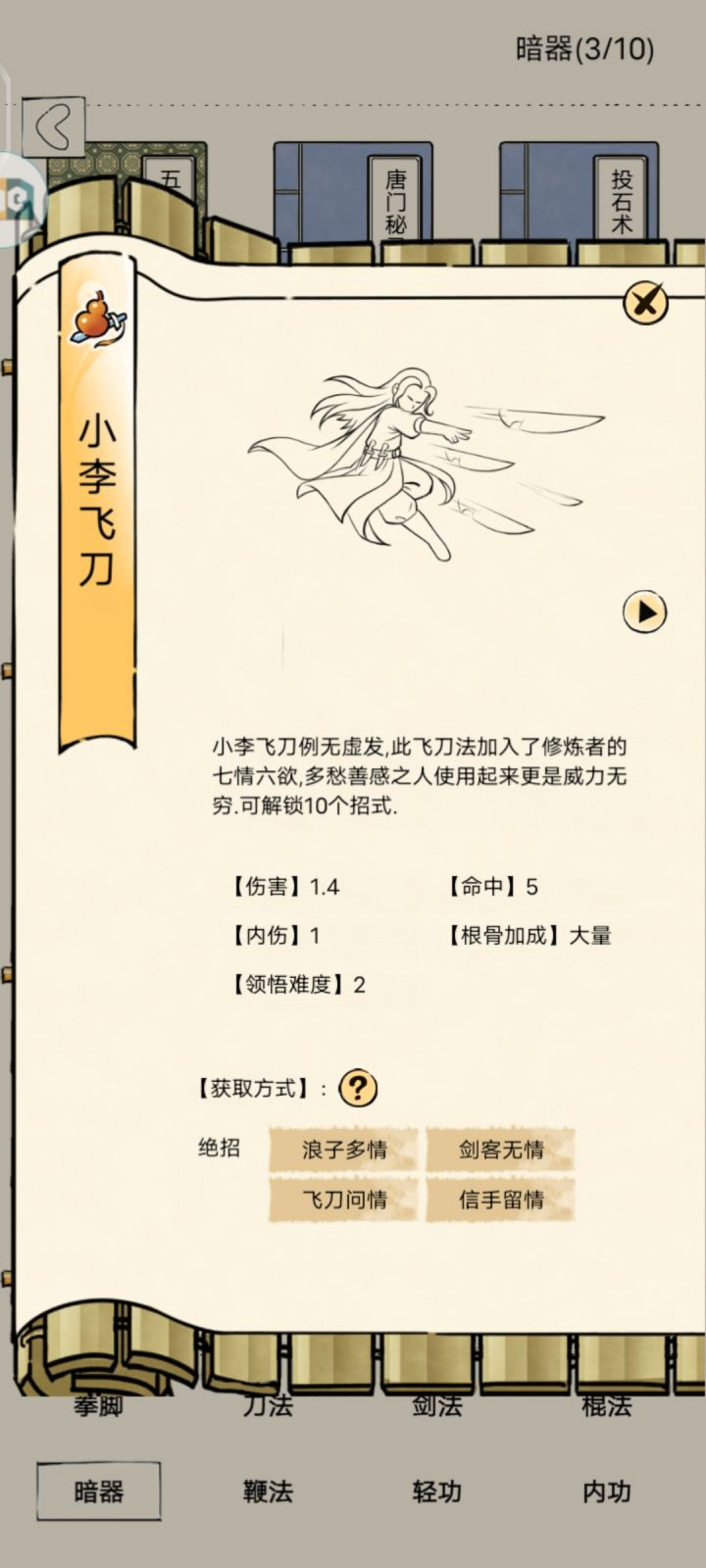 然后买500金的探花服开始拿小李飞刀,期间可以慢慢抽小李飞刀的领悟了,而且可以去东海钓九阴真经93,拿到小李飞刀,把88令牌的暗器镖洗好,把读书读200级把基础剑转换为暗器学习小李飞刀,小李飞刀+93+疾风步,基本成型。疾风步300级,小李飞刀300级,内功150/200就行。