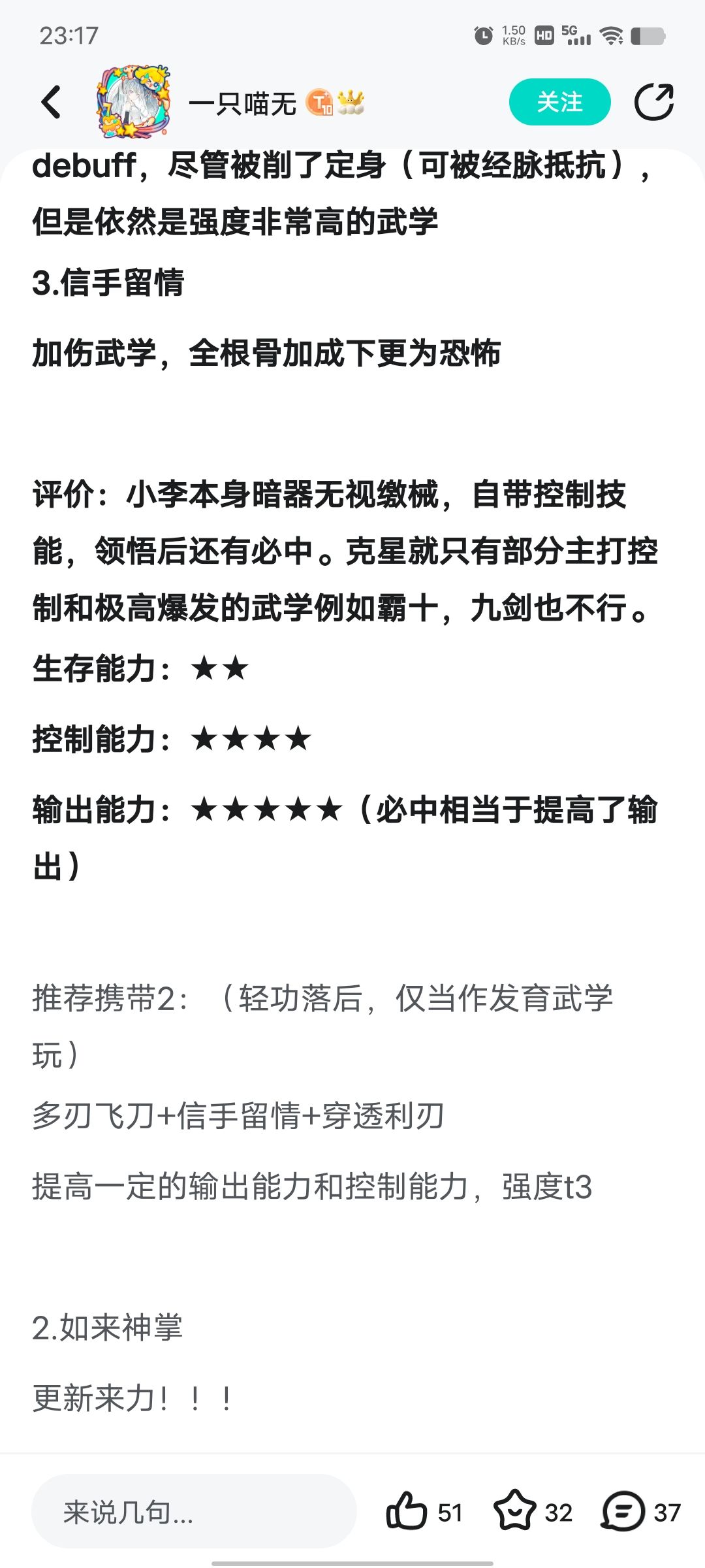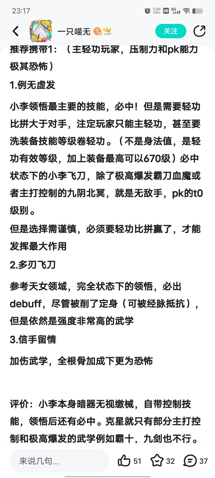 众所周知,目前小李飞刀玩家其实并不多,因为小李飞刀是根骨加成而且领悟吃最高轻功等级,大后期基本上没内力加成的武学都不太行,所以小李飞刀适合0-3轮前中期玩,4轮不建议玩小李飞刀。