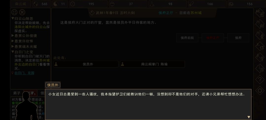 苏州城→侯府→侯府正厅→[人物:侯员外]对话。