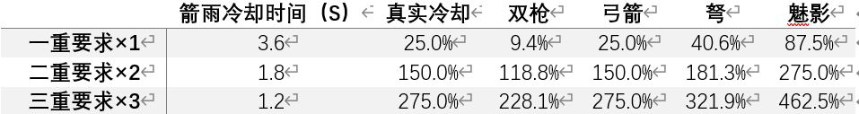 4、多重箭雨重叠:在上一发箭雨未消失时,释放下一发箭雨即可重叠多层箭雨,具体各武器CD阈值如下表: