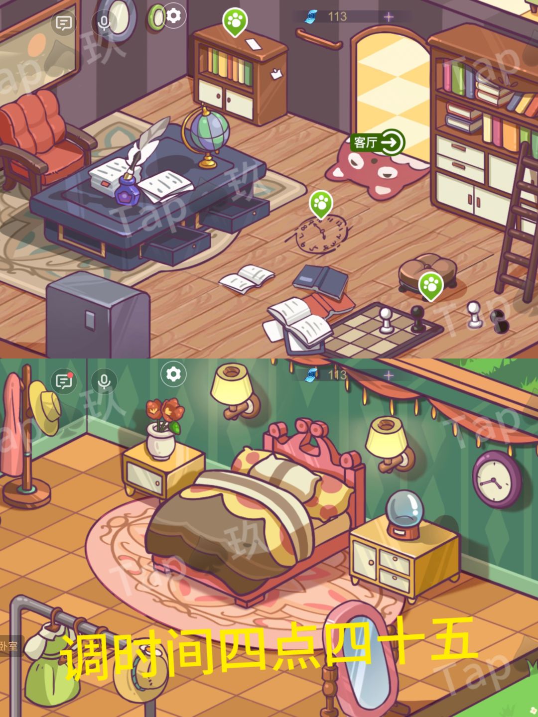 4-根据多多擦拭后书房地板后提供的图案,多多传送的【指针】,调整卧室的钟表(时针4分针9),获得【钥匙】传给多多。