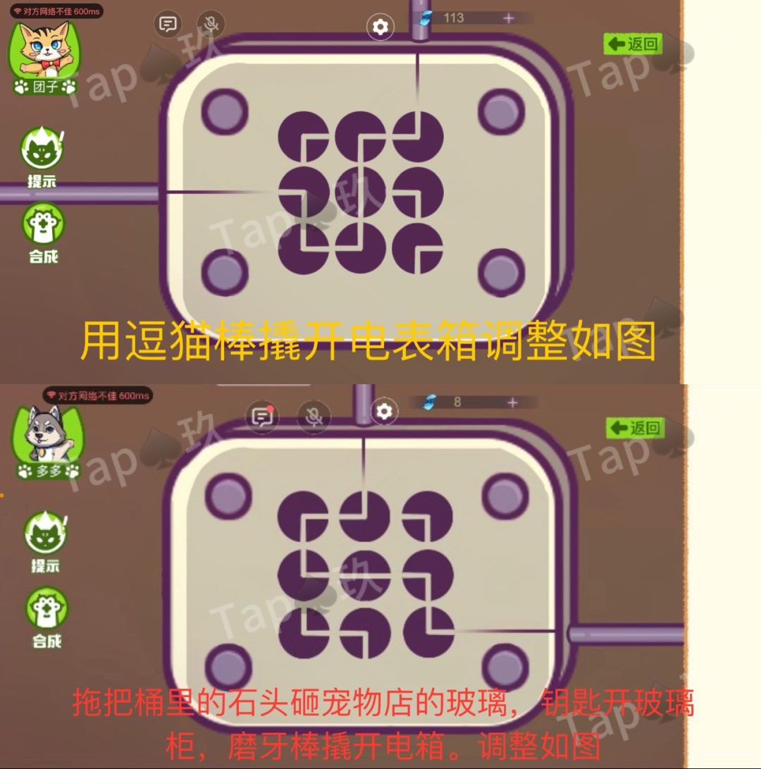 8-多多在家里门后的拖把处拾取【石头】,回到宠物店,用【石头】砸破放钥匙的柜子玻璃,拾取【红色的六号钥匙】。用【钥匙】打开宠物店的黄色柜子,拾取【磨牙棒】。团子多多同时来到宠物店外,使用【磨牙棒】【逗猫棒】撬开点电表箱,完成解谜后,喷泉正常运行,获得【笑脸挂坠】