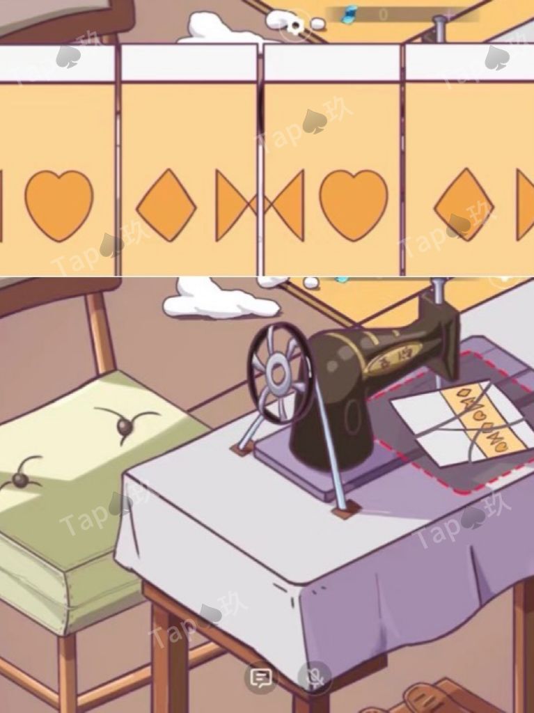 2-点击缝纫机,拾取【针】【线】。对着缝纫机使用道具。放入【四块碎布】,拼好图案,获得【被套】,把被套上的图案告诉多多。