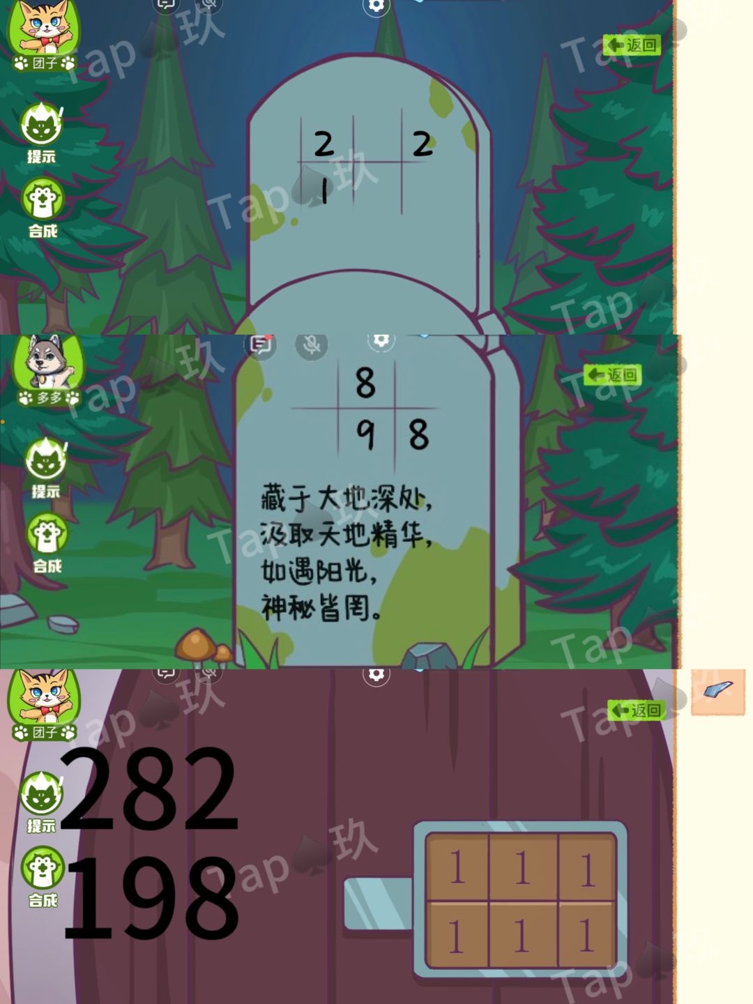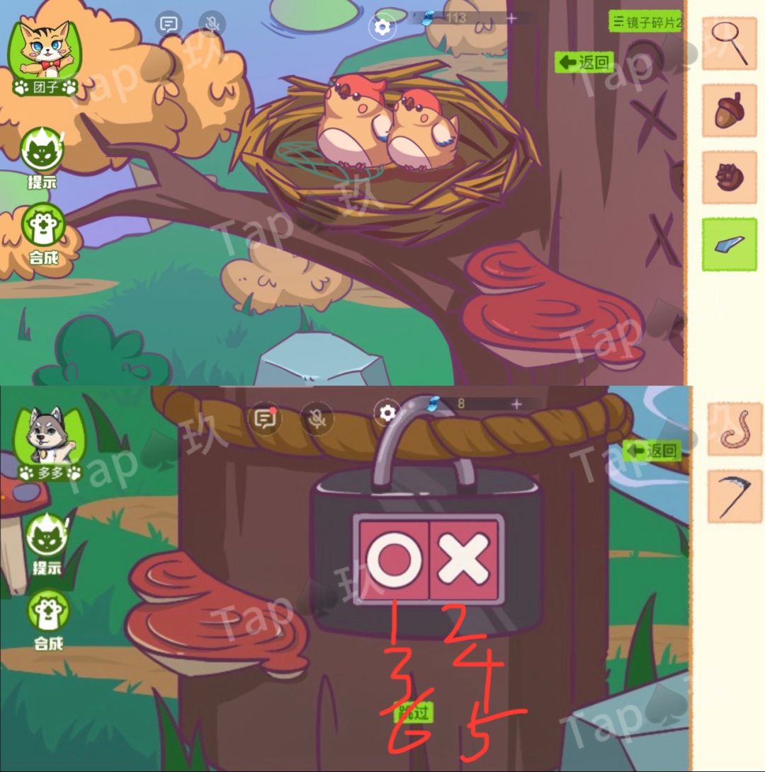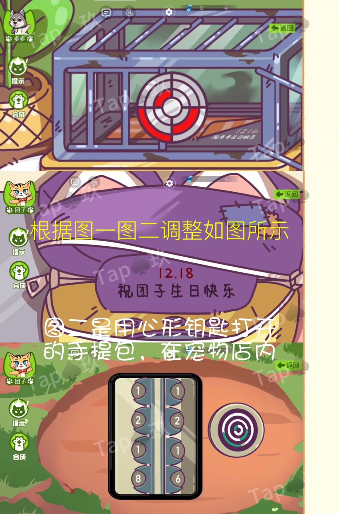 4-团子点击左侧架子上的布包,用【心形钥匙】打开,获得生日线索【1218】。团子多多同时去树下解开日记本。(左边1218,右边1216),对应团子跟多多的生日。打开日记本获得线索【12315】