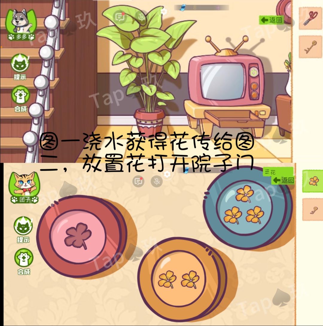 1-客厅桌子处地下拾取【水壶】,用其给电视旁边的花浇水,摘取【三朵花】传给团子。