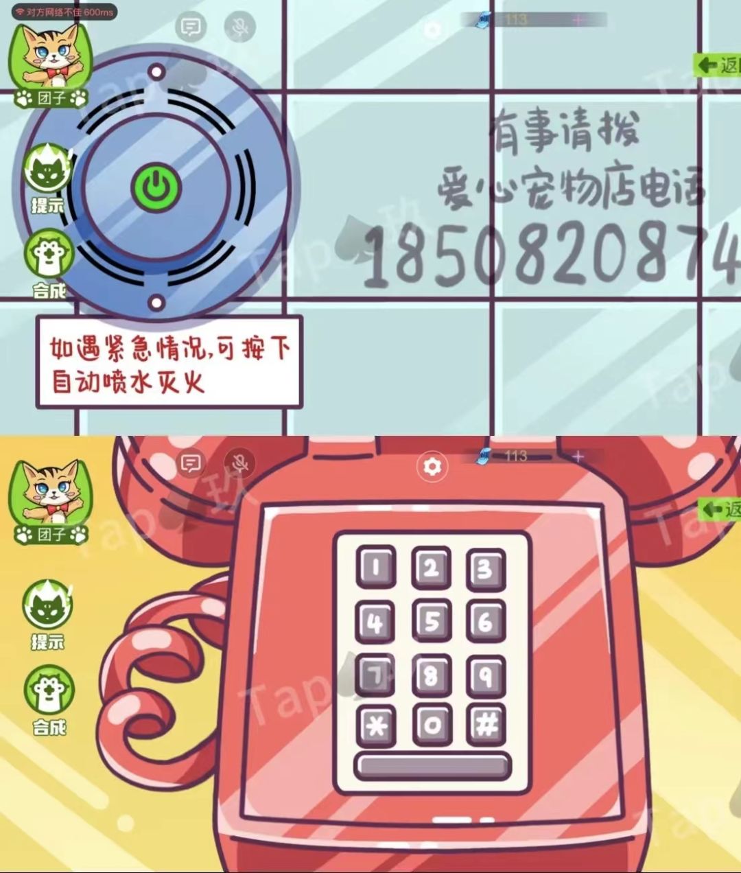 7-团子按下墙上的自动喷水按钮,墙上出现宠物店电话【1850820874】,回到宠物店,根据线索打电话。得到提示【六号钥匙】,告诉多多。