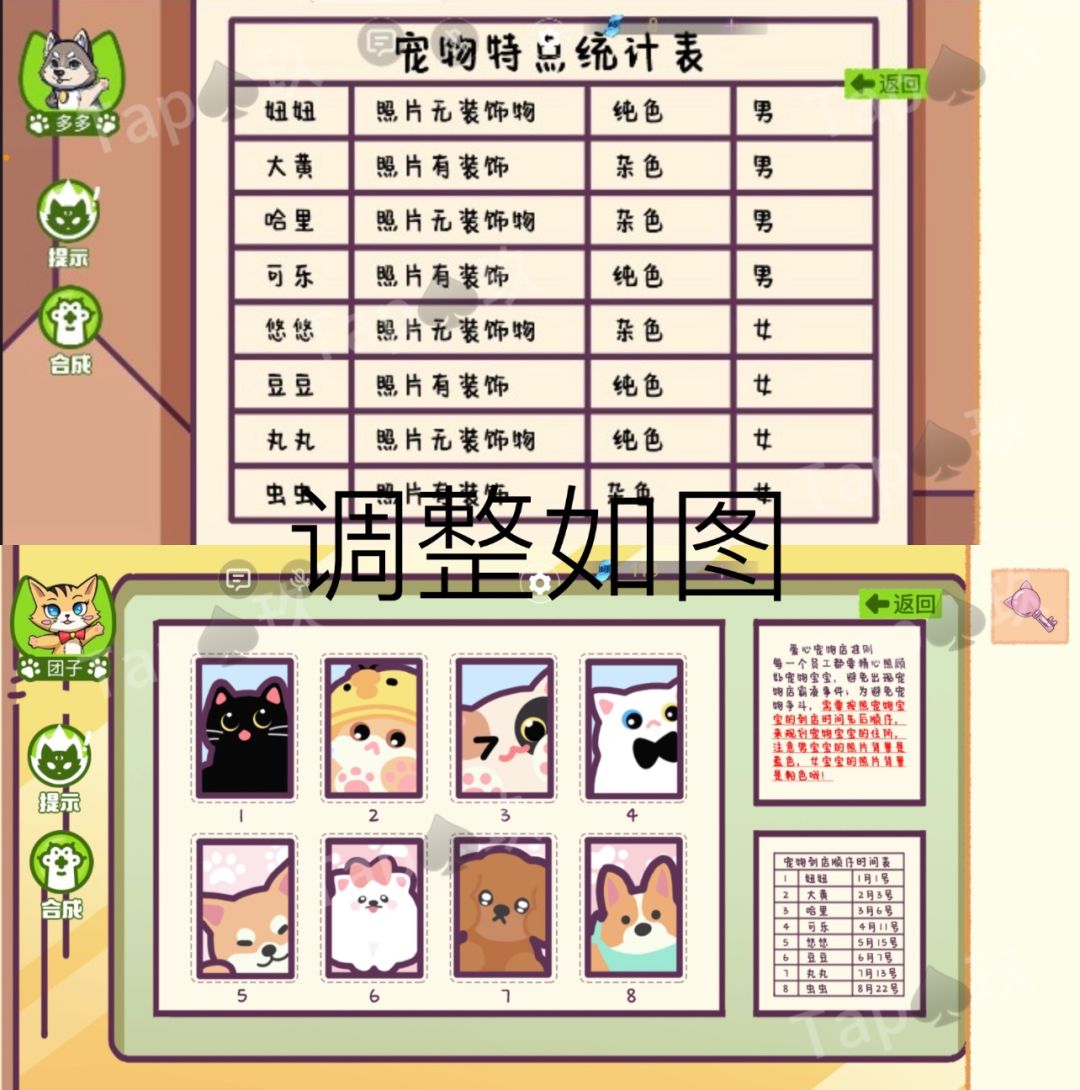 3-多多拾取宠物店地下的纸张【宠物特点统计表】,告诉团子,团子完成宠物位置的迷题。获得【心形钥匙】
