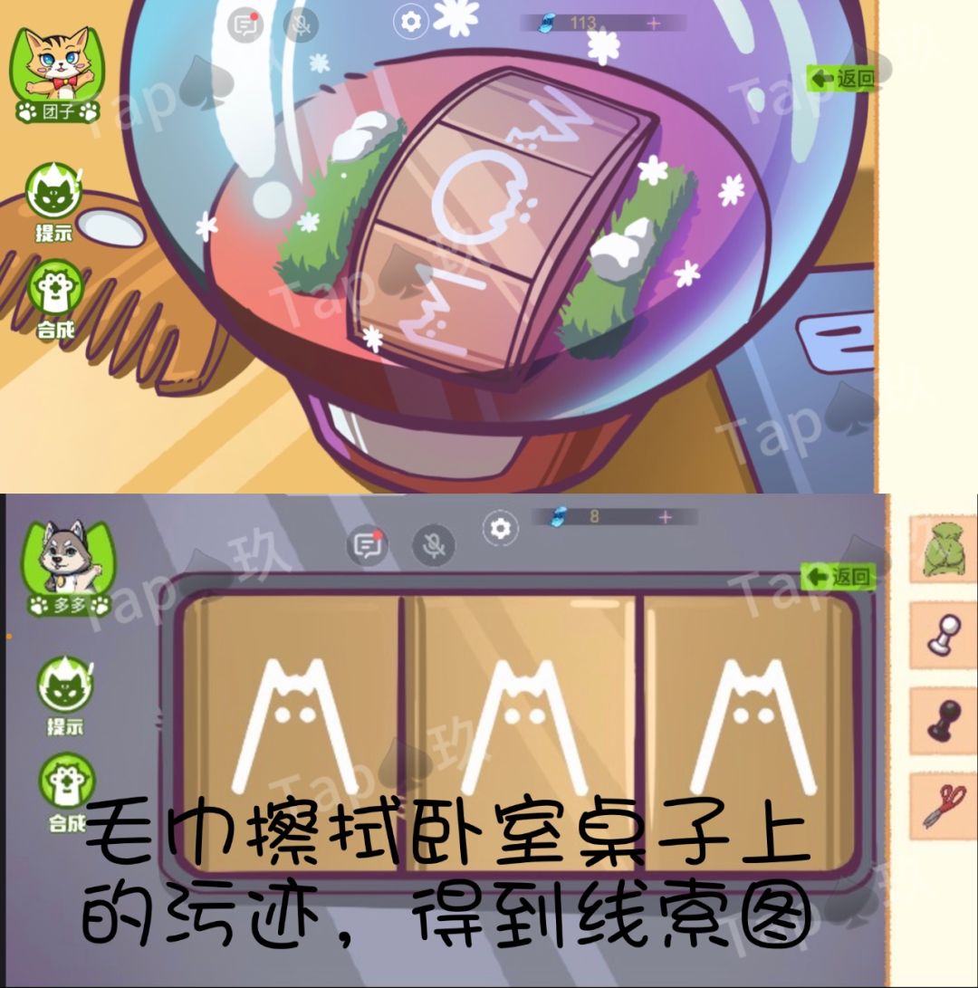 3-书房墙壁处拾取【毛巾】,用其擦拭卧室床头柜上的物品,获得图案线索。告诉多多。
