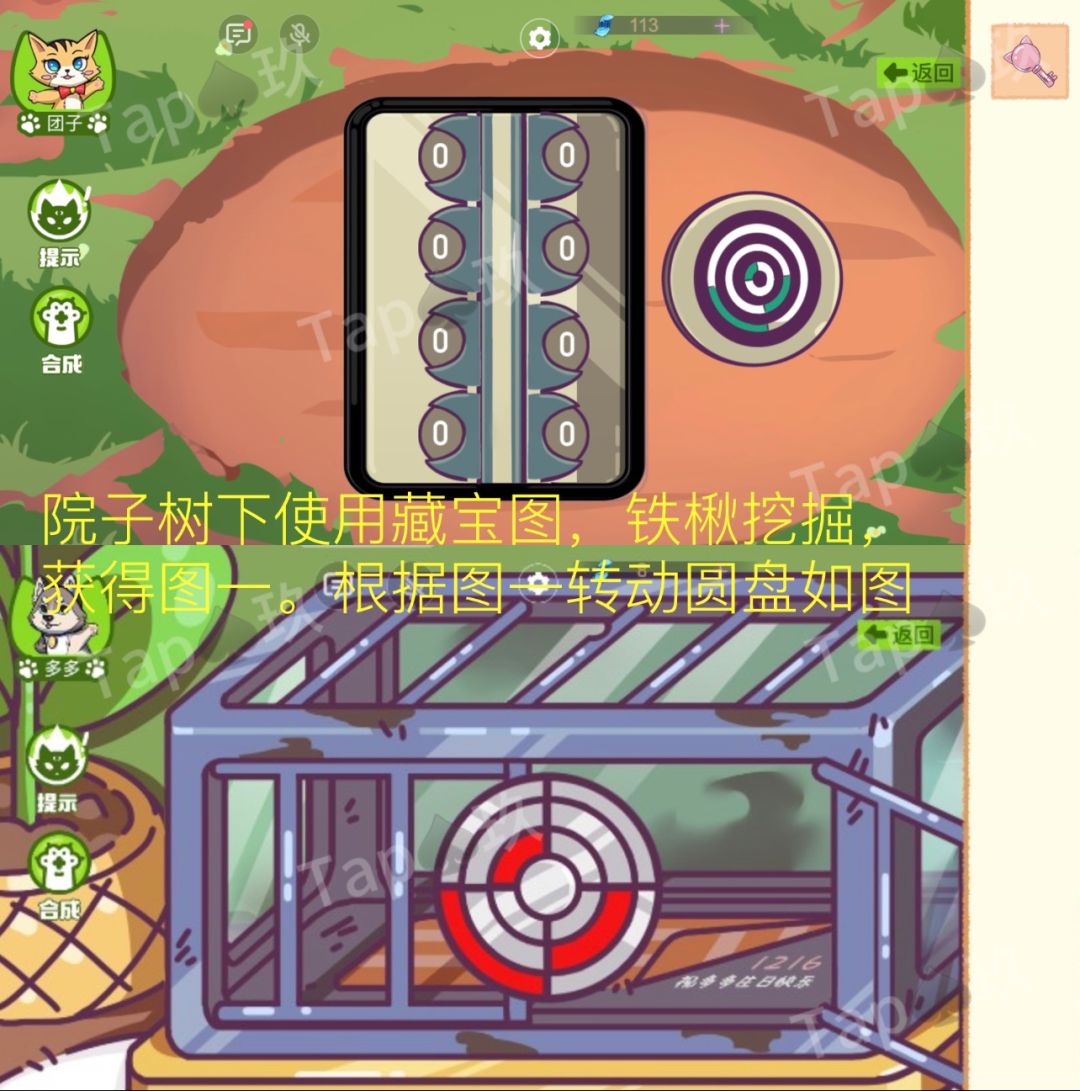 2-团子在树下点击使用【藏宝图】,多多同时在树下用【铲子】挖掘。获得【圆盘线索】。多多根据【圆盘线索】打开宠物店内的狗笼子。打开后狗笼子内出现数字线索【1216】