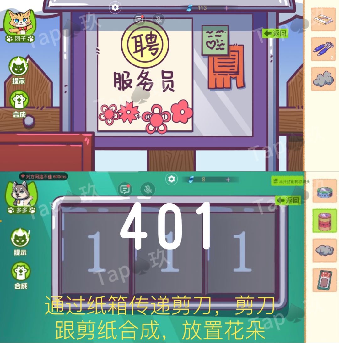 4-【剪刀】【剪纸】合成,获得【剪纸红花】。将其放入车站站牌的广告处,获得密码(401),告诉多多。