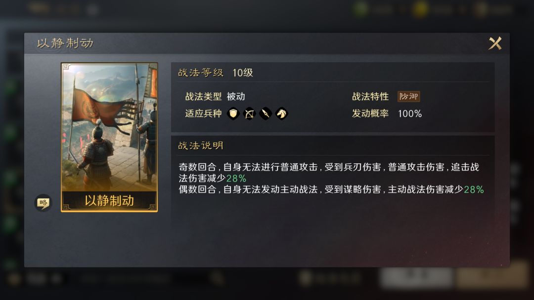 【以静制动】属于被动防御战法,每个回合开始限制自己行动的同时会获得不同效果的减伤能力。