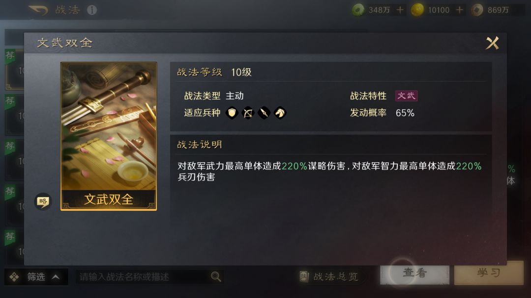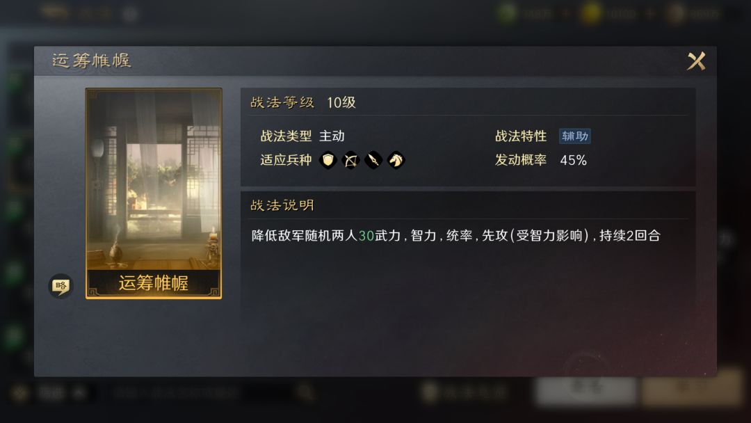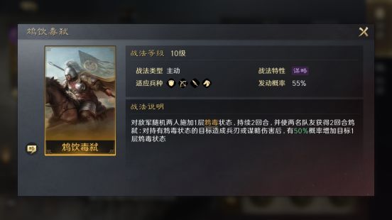 作为主动战法,能够令我军武力和智力最高的单体对敌军全体造成兵刃或谋略伤害。