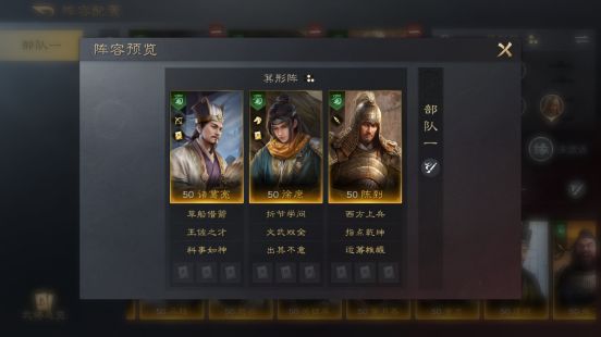 陈到的【西方上兵】可以使诸葛亮获得减伤,徐庶获得减伤和回复效果,加上诸葛亮的高智力和高统率,配合徐庶的高爆发和足够的控制,部队的功能性极强。