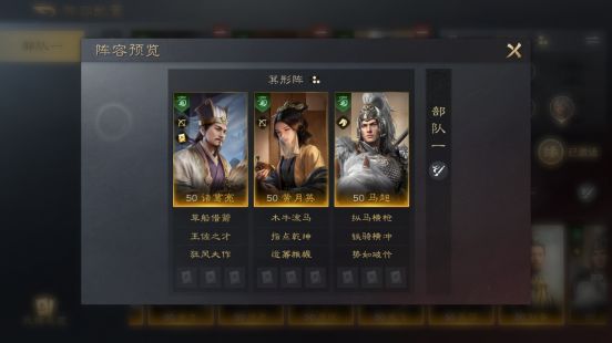 蜀国阵容,诸葛亮黄月英缘分加成提升了部队伍生存能力,诸葛亮跟马超的双核心阵容在搭配【指点乾坤】,能够让伤害最大化的同时使马超高频释放【纵马横枪】,从而大大提升部队伍的输出能力。
