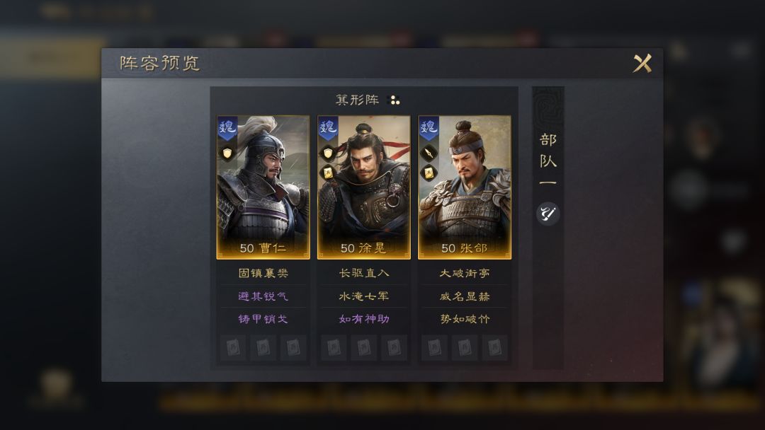 曹仁前排抗伤并施加“技穷”,徐晃搭配【如有神助】增加【水淹七军】和自带战法的发动率,使部队的控制最大化的同时打出稳定的输出。