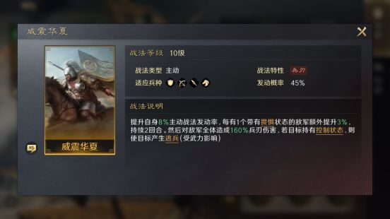 组合思路:【水淹七军】对敌军施加“洪水”并造成伤害搭配【威震华夏】能够大大提升兵刃伤害。