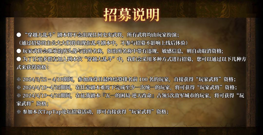 1、通过战役排名、社区活动 等途径获得的“玩家武将”资格,需创建治所且只记录一次,招募名额有限,先到先得;