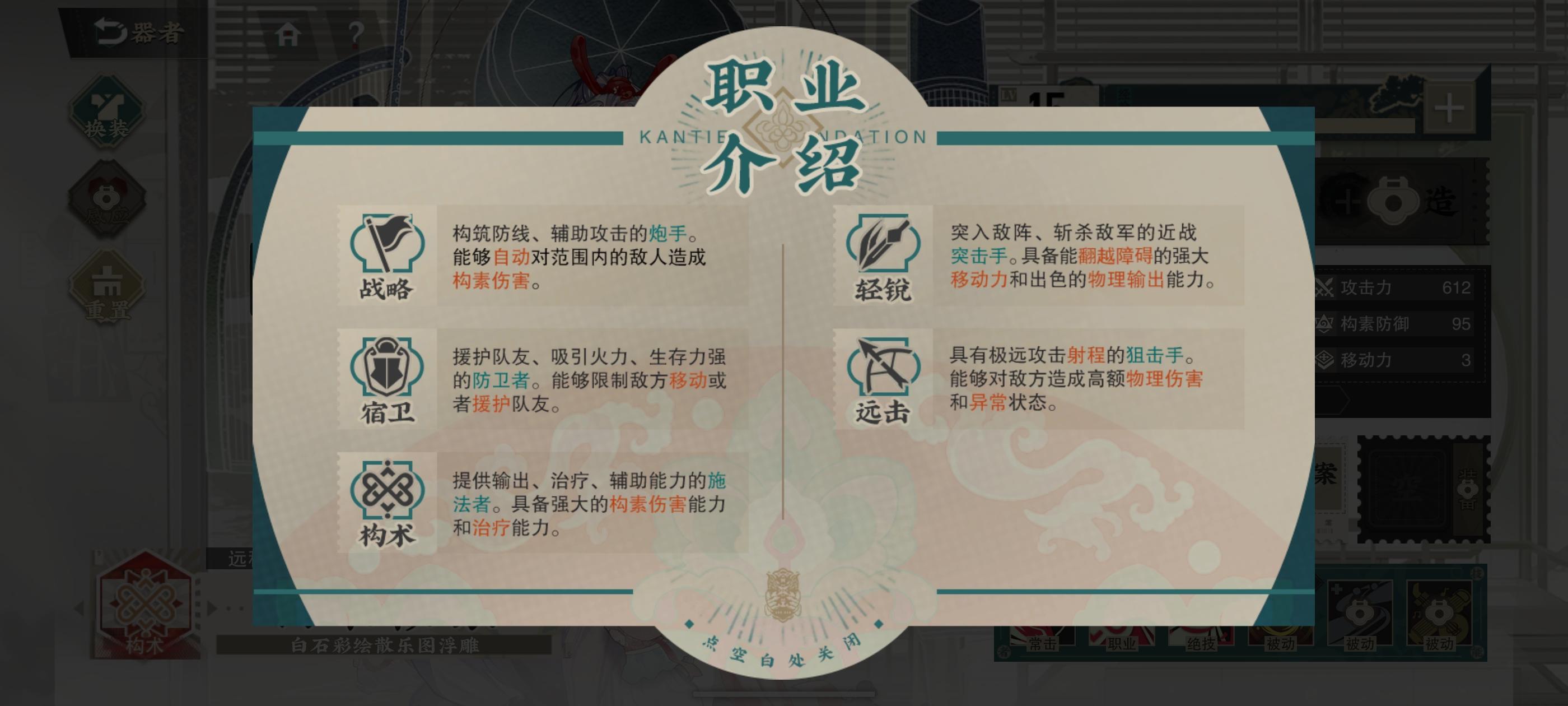 ⑥游戏配队:目前游戏红、金、紫三种品质角色,职业分为5种:战略、宿卫、构术、轻锐、远击。