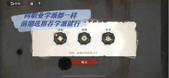 首次进入深造功能时,会弹出选择深造学派效果的界面。这里需要注意的是,深造学派仅不同职业之间有区别,同职业可选择的三种学派都是一样的。