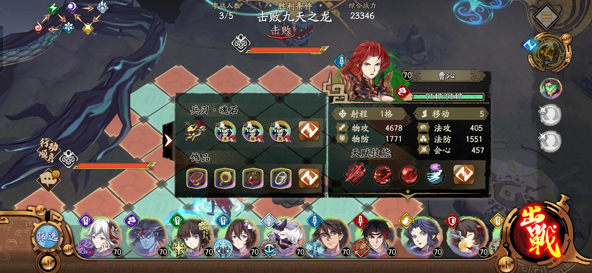 曹沁挂流火减防砍一刀,大约四万多。(练度,站位在头最左侧)