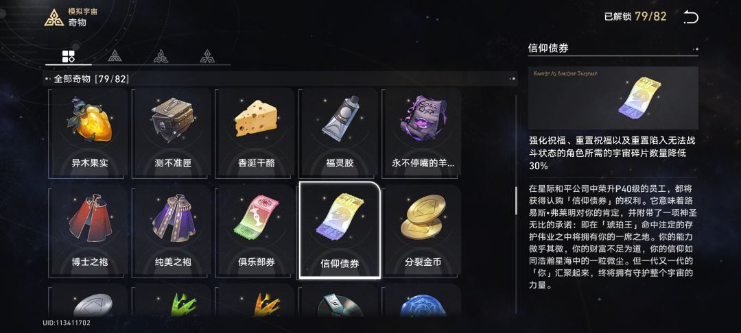 在交易区域中也有讲究,此时我们手上必有的一定是八卦和金币,八卦是任意获取的碎片数量增加100%,就是翻倍,包括但不限于公司时刻被动效果、骰面放弃选择时的碎片增加,金币则是进入下一区域时增加6%,八卦加持下就是12%,也就是碎片越多,获取越多,如果你已经获取的和平的代价(每次走进交易区域增加150碎片,八卦加持增加300),那么可以基本无视,正常第一位面进入第二位面时的碎片数量会在800~1200左右,一个交易区域祝福需要1600碎片,返还960,总消耗640,在没有其他来源的情况下我们进入2~3次交易就会缺钱,所以在这种情况下建议优先选择命途祝福,凑齐10~14个之后把生存向的祝福买了,当然这只是没钱的时候,有钱了当然是我全都要,所以在购买祝福前我们可以先去黑塔那里看看奇物,看看有没有和平的代价以及其他奇物(在上方都有列出),当你的碎片数量是几千几千的时候就可以算真的胡了,只要买买买就行,我有一把就是走完交易区域之后还有1w多碎片,搭配袍子的增伤,简直不要太爽!