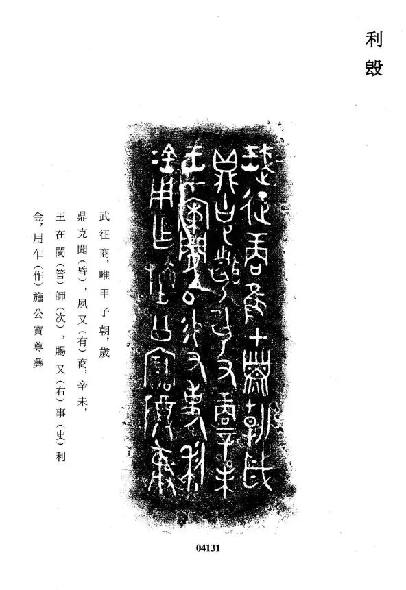 原文记载了历史上的著名战役—牧野之战(武王伐纣),武(王)征(伐)商,唯甲子朝(在甲子日的早晨),岁鼎(岁星当空),夙又商(一夜之间将商灭亡),辛未(甲子日之后过了七天),王在阑师(地名),赐又(右)事(史)利(“利”是人名)金(青铜),用作檀公宝尊彝(以纪念先祖檀公 )。