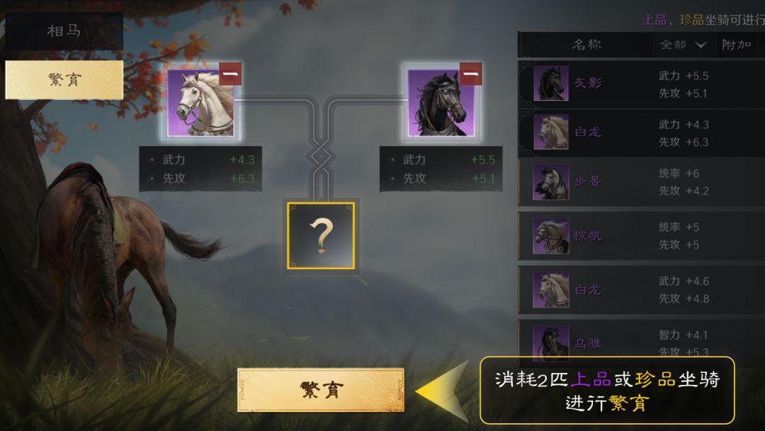 2.繁育规则:消耗2匹上品或珍品坐骑进行繁育,产生新的坐骑;珍品与上品马也可以繁育,产生新的坐骑;