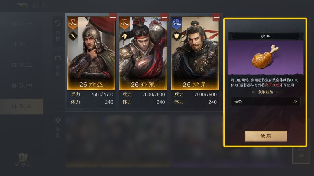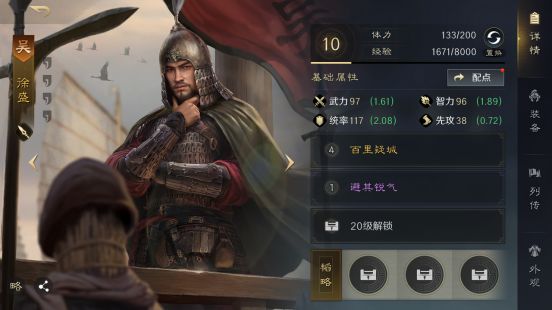 前期升级武将等级至关重要,铜币,鸡腿优先给到主力部队,尽快提升武将等级与战法等级。