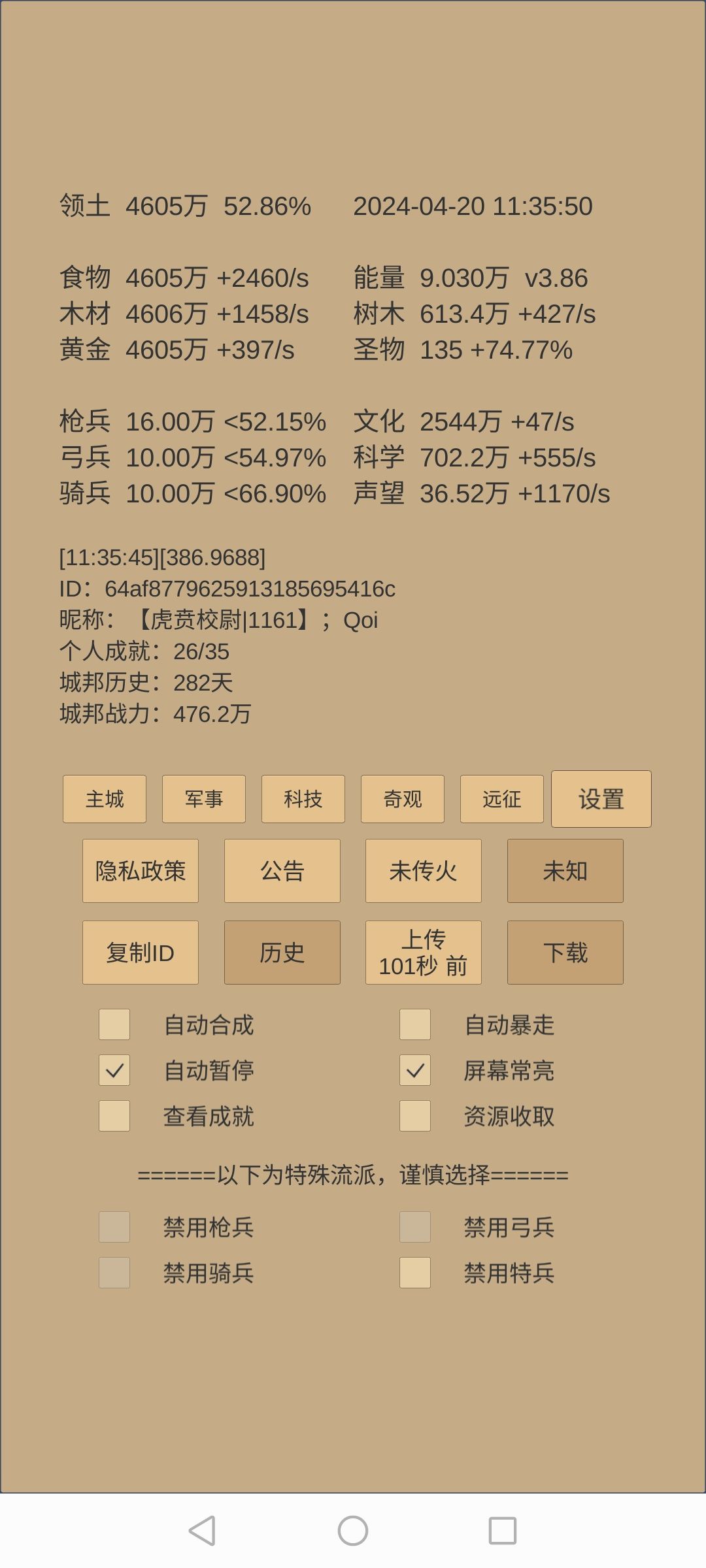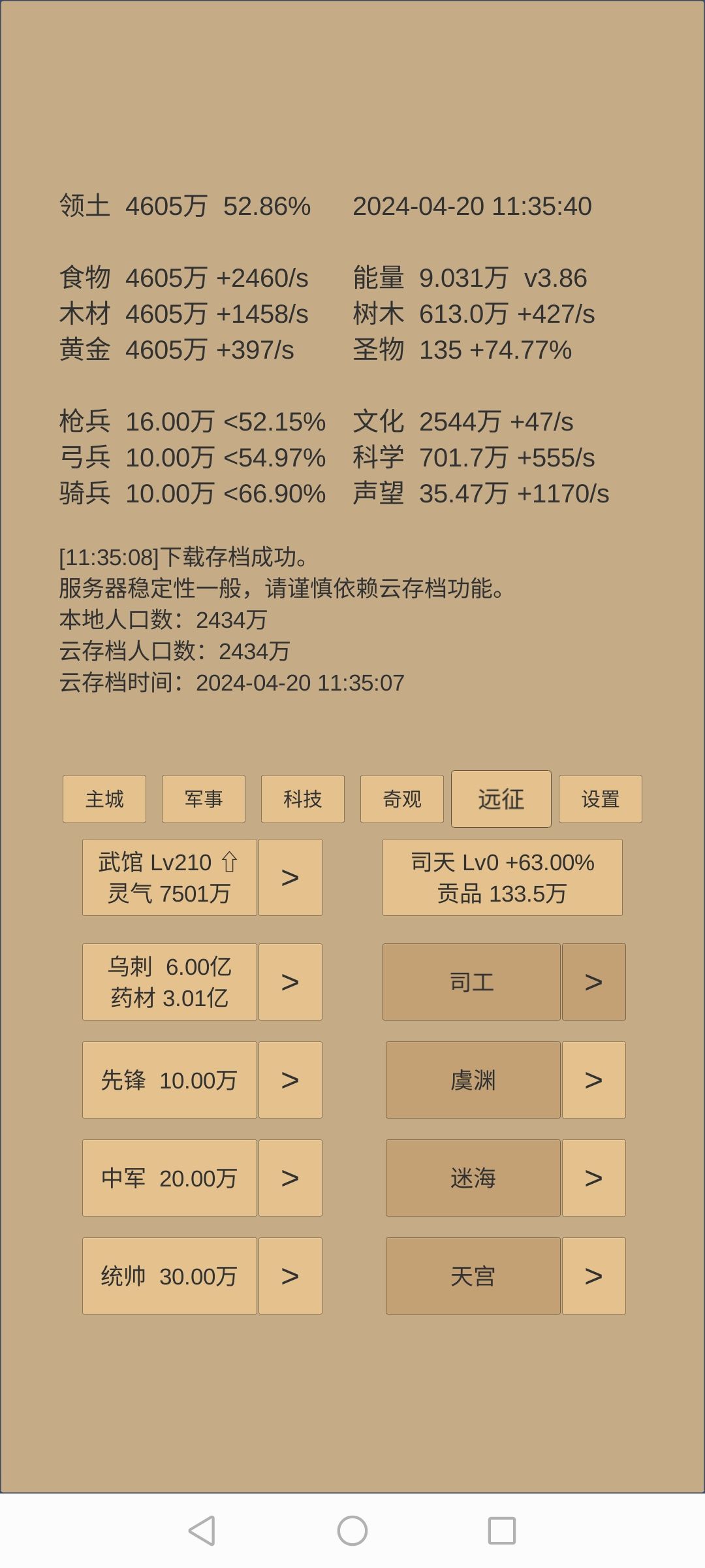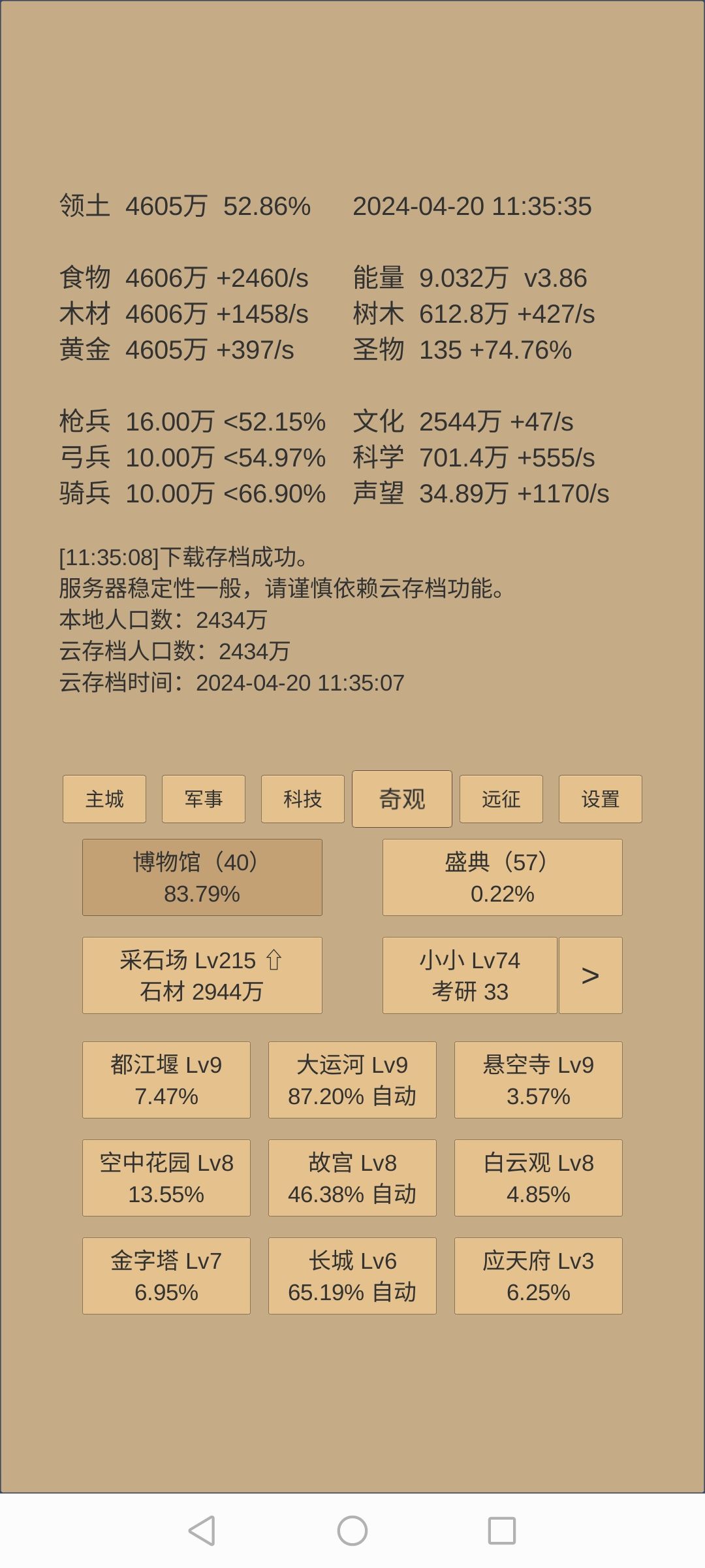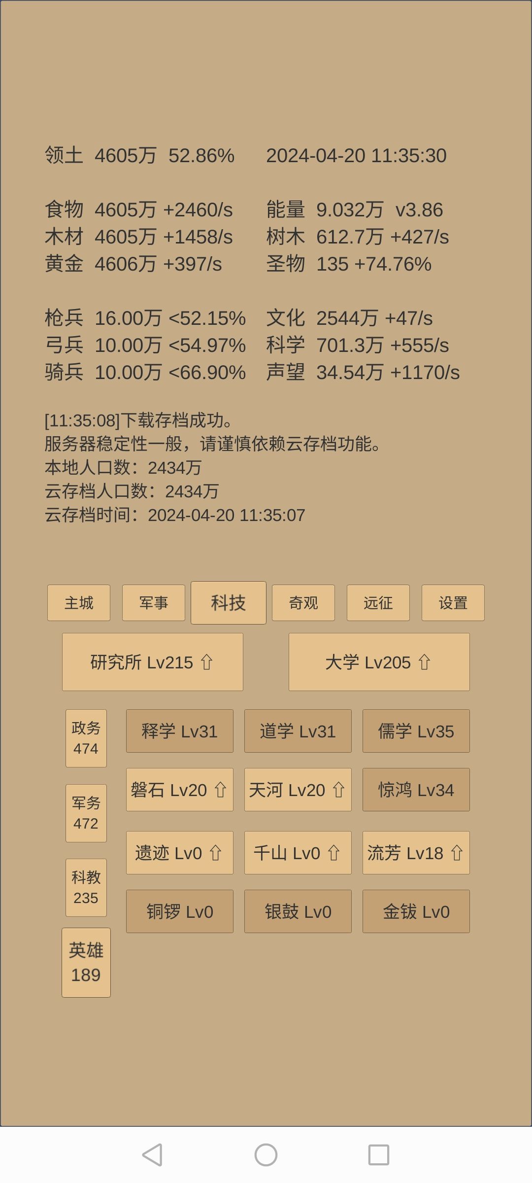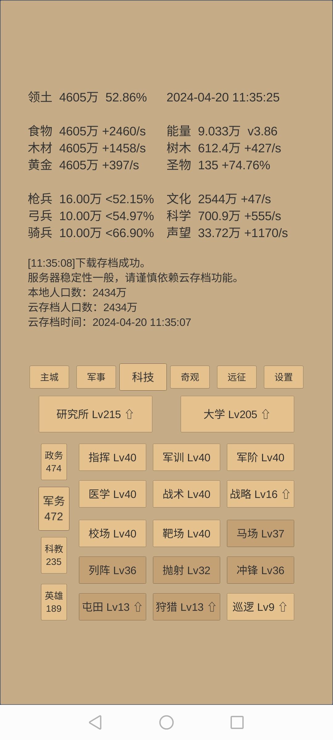 3.升博物馆前攒药,文化快满时,推3镜,提前加税,先推道镜,边推边升级数学和指挥,推不动道镜后,减税推集镜,推灭镜。3镜都推不动后升博物馆。期间视科学情况补军训、战术、医药,建筑、物理。