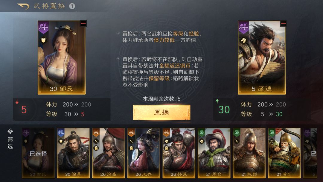 如果玩家们在前期就抽取到更合适的武将,可以通过武将置换系统,把阵容之中已有等级较高的的武将进行置换,以获取更加适合当前需要的武将阵容搭配。