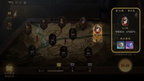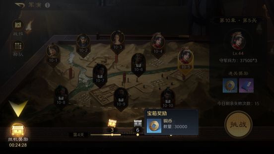 军演可以也是获取铜币的主要渠道。每章节第5关与第10关,均有两次机会收获丰厚的铜币。随着章节难度的递增,所得铜币会增加。除了章节奖励以外,第3关、第6关的通关宝箱和挂机奖励也可以获得铜币。