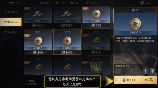 贡献商店需要同盟贡献兑换铜币,每周上限6次。