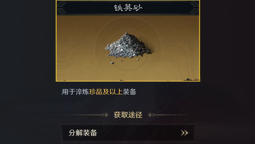 2.【淬炼材料获取】:淬炼珍品及以上装备需要使用铁英砂。