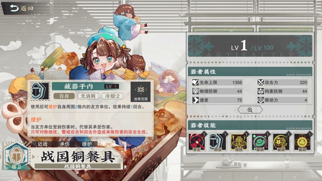援护型职业技能非常好理解,就是代替范围内的己方单位承伤!在战斗中使用此类职业技能,就可以轻松查看可援护的范围(浅蓝色格子)。拥有此类职业技能的器者有曾侯乙编钟、战国铜餐具等等。
