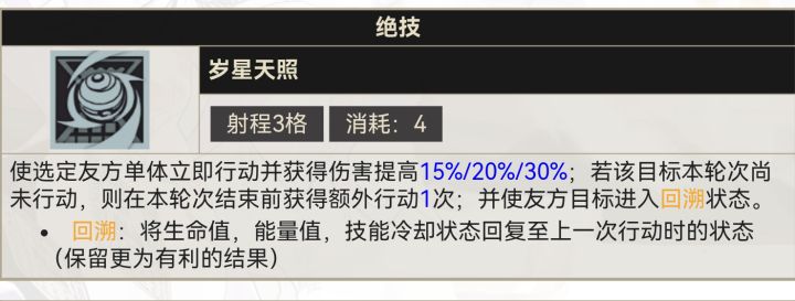 回溯:使该角色上回合的能量/血量/技能冷却(全部保留最有利的结果)回溯到上一回合的状态,举个例子,如果有器者上回合刚放完大招血量很健康,利簋把大招给他后,他立马又能放个大招,实现“双大”。现版本利簋加金瓯永固杯秒BOSS轻轻松松。