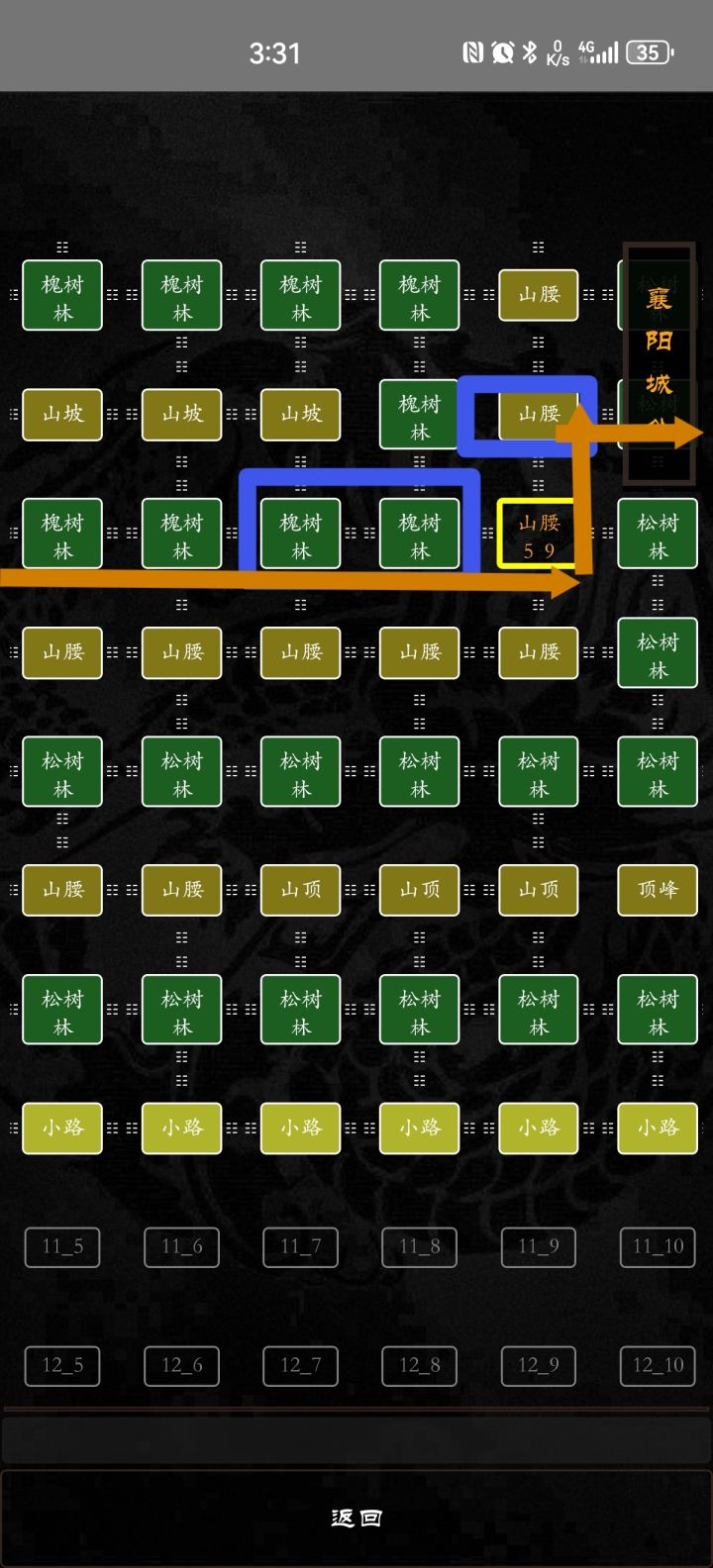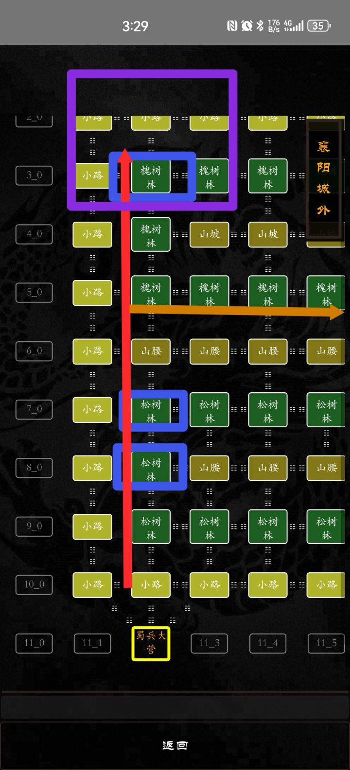 如第二张图所示,从5-2的槐树林东进,沿橙色路线直走,中间会在5-7、5-8遇到两波兵,然后5-9转北上6-9打一波怪,再东进,就进入吴国区域了。