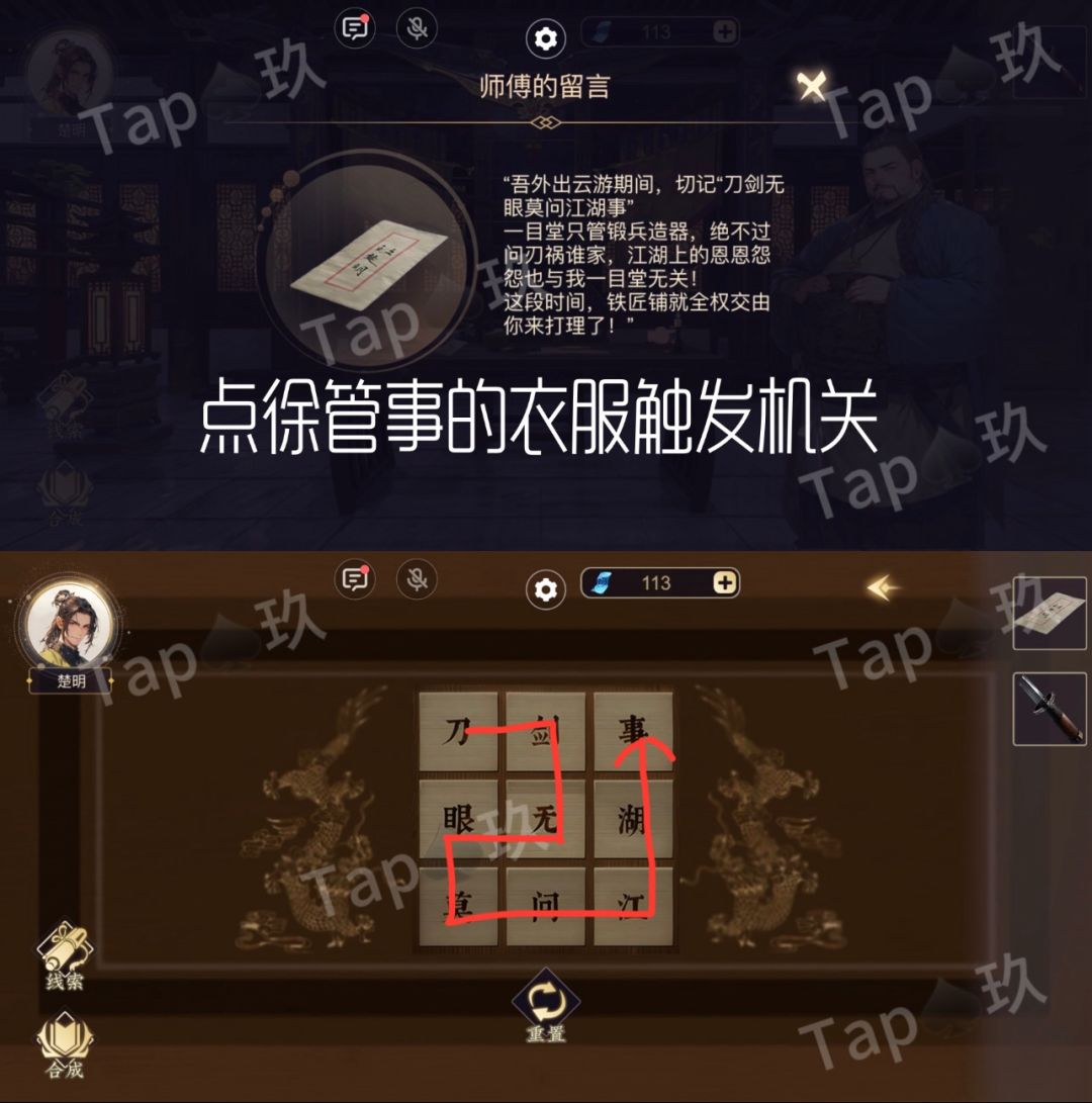 2-点击桌子上的信件获得师傅的留言【刀剑无眼,莫问江湖事】。点击徐管家的衣服触发机关。,用师傅的留言打开箱子。获得【线索纸条】【钱袋子】