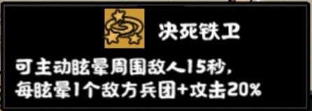 同样,使用武将技之后,可眩晕大范围敌军15s,每控制一队敌军,自身获得20%攻击力提升,持续20s,冷却时间为20s。