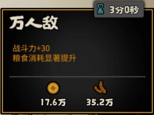 提供30点战斗力,但是会增加1粮/兵的粮食消耗,消耗方面不算特别高,当然也不算低。