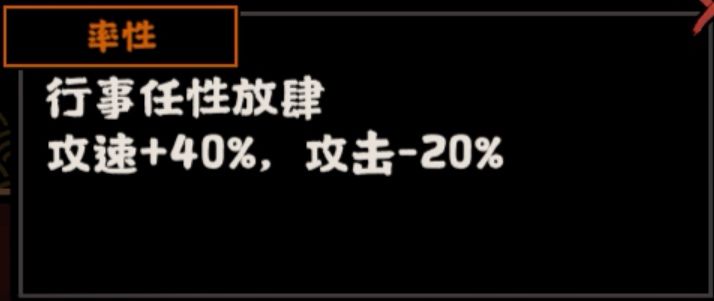 先说武将性格吧,率性能够提升40%攻速,但是会降低20%攻击力。