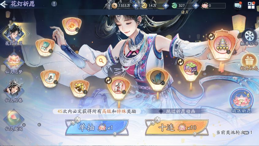 3.花灯祈愿中,每抽取80次必出该轮次的所有高级奖励和特殊奖励,抽取完该轮内的所有高级奖励和特殊奖励后,大侠可选择进入下一轮。