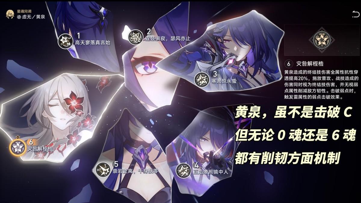这种在弱点击破方面做文章,对于强度的控制无疑会比纯粹的数值碾压,来得安全。例如2.1新大C黄泉,0魂、6魂都有特别篇幅介绍该角色的削韧优势。甚至就连砂金,都有比其他生存位更强的削韧表现。