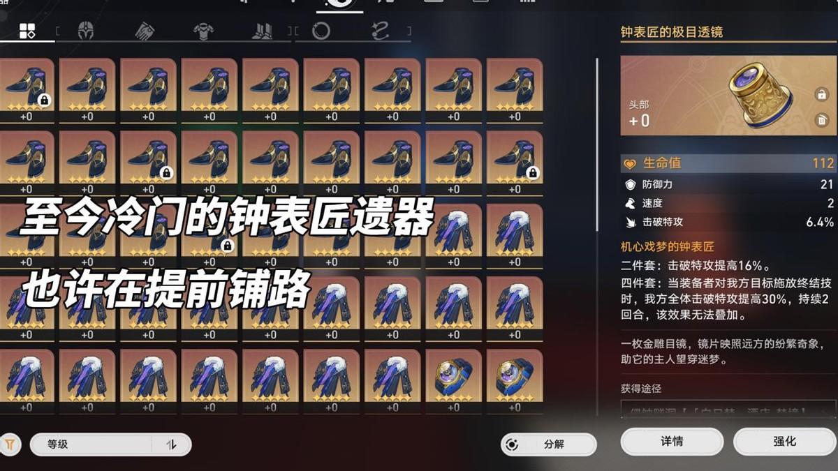 当然,这并非鼓励各位去刷「机心戏梦的钟表匠」,赌一个未来可期。崩铁的遗器套装对比散件的差距还算可以接受,既然现在有击破占优的趋势出现,仅仅是建议,日常无论任何遗器,哪怕双暴全歪击破了,你也别愤而当经验喂掉,留着,保不准哪天就发光成金子了呢~