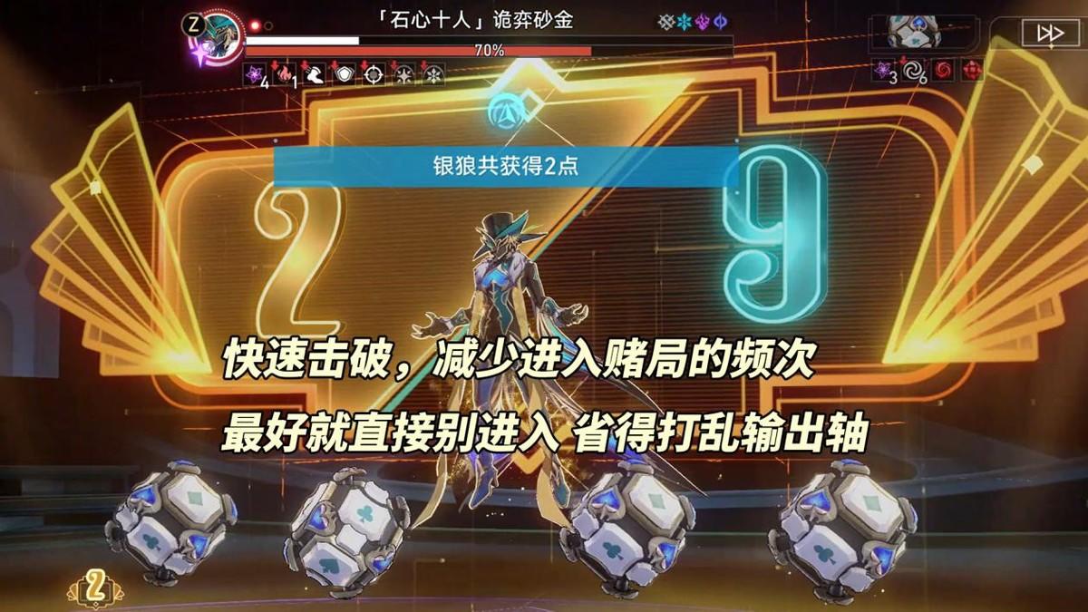 ②「石心十人」诡弈砂金,血量高达201万,喜欢邀你入赌局,扣你能量、骗你伤害、浪费增益、吞你回合。相应的快速击破,能够减少他烦人机制的发起频率,留给你更舒适的输出空间。