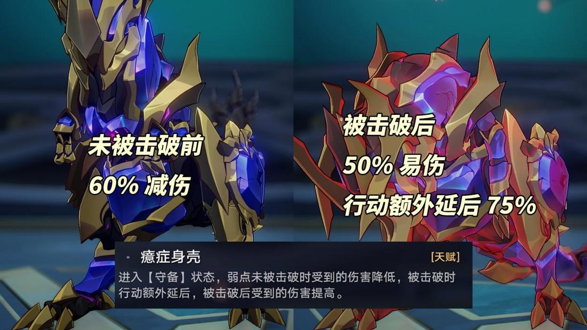 ①忆域迷因「狂怒褪去之壳」,血量高达58万就算了,还带有60%减伤。击破后,行动额外延后75%、以及50%易伤。