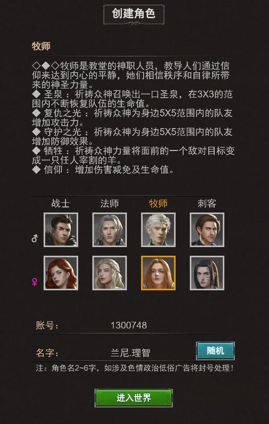 目前游戏提供四个角色——战士、法师、刺客和牧师,选什么看自己喜好,单机的话我推荐战士,能抗能打;